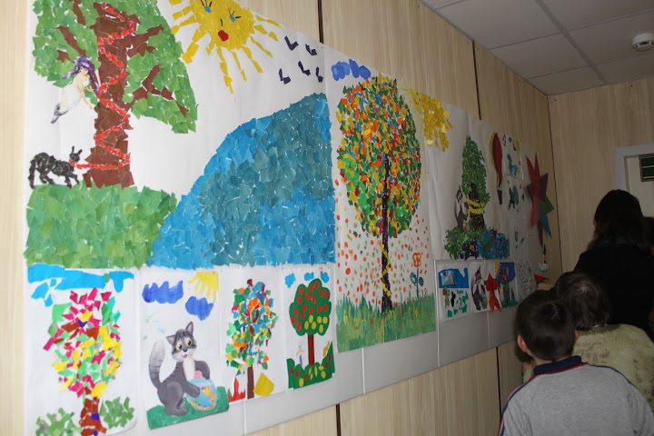 В нашей группе молодая креативная художница Светлана. Она придумала первую тему для мастер-класса. Мы при помощи очень интересной технологии (используя рваные кусочки цветной бумаги) планируем вырастить сад-аппликацию из волшебных деревьев. Занятие начинает волонтер Елена (у нее большой опыт работы с детишками), она вспоминает с ребятами героев сказок и плавно переходит к теме нашего занятия. Одно из самых знаменитых сказочных деревьев, конечно, пушкинский дуб (У Лкоморья), Лена вместе с детьми хором декламируют стихотворение. После этого дети делятся на 3 команды и начинают при помощи волонтеров растить свои волшебные деревья.